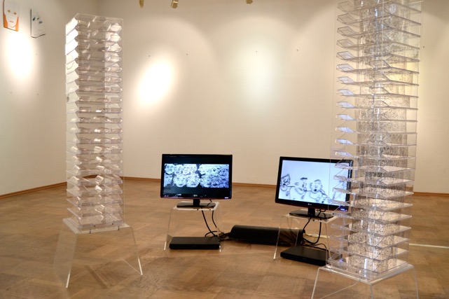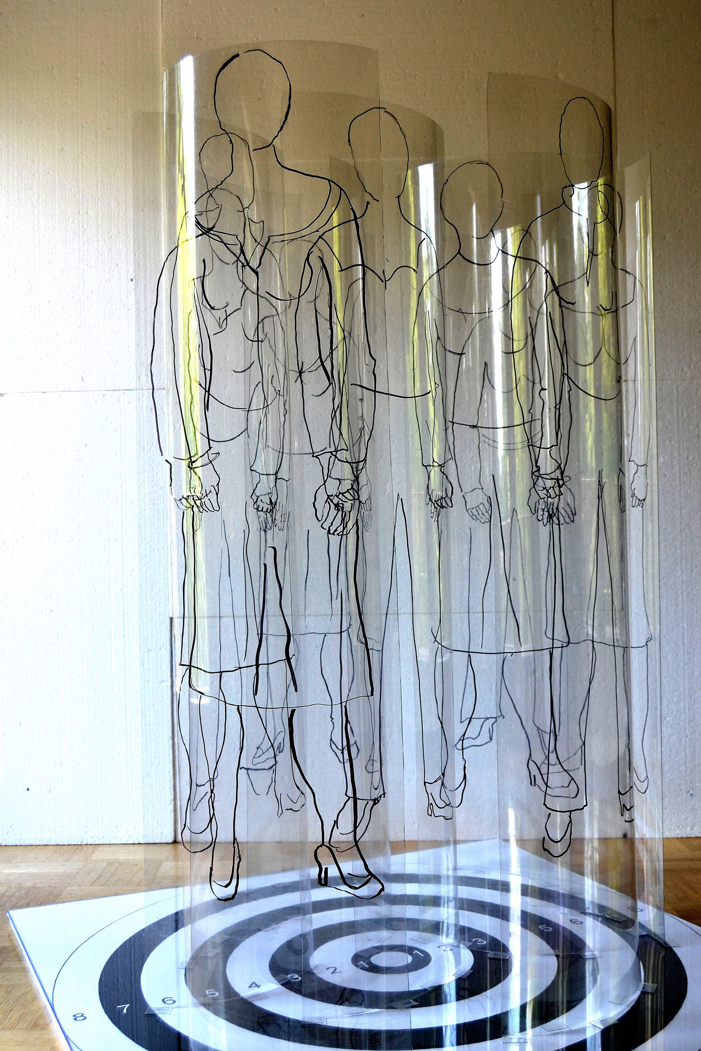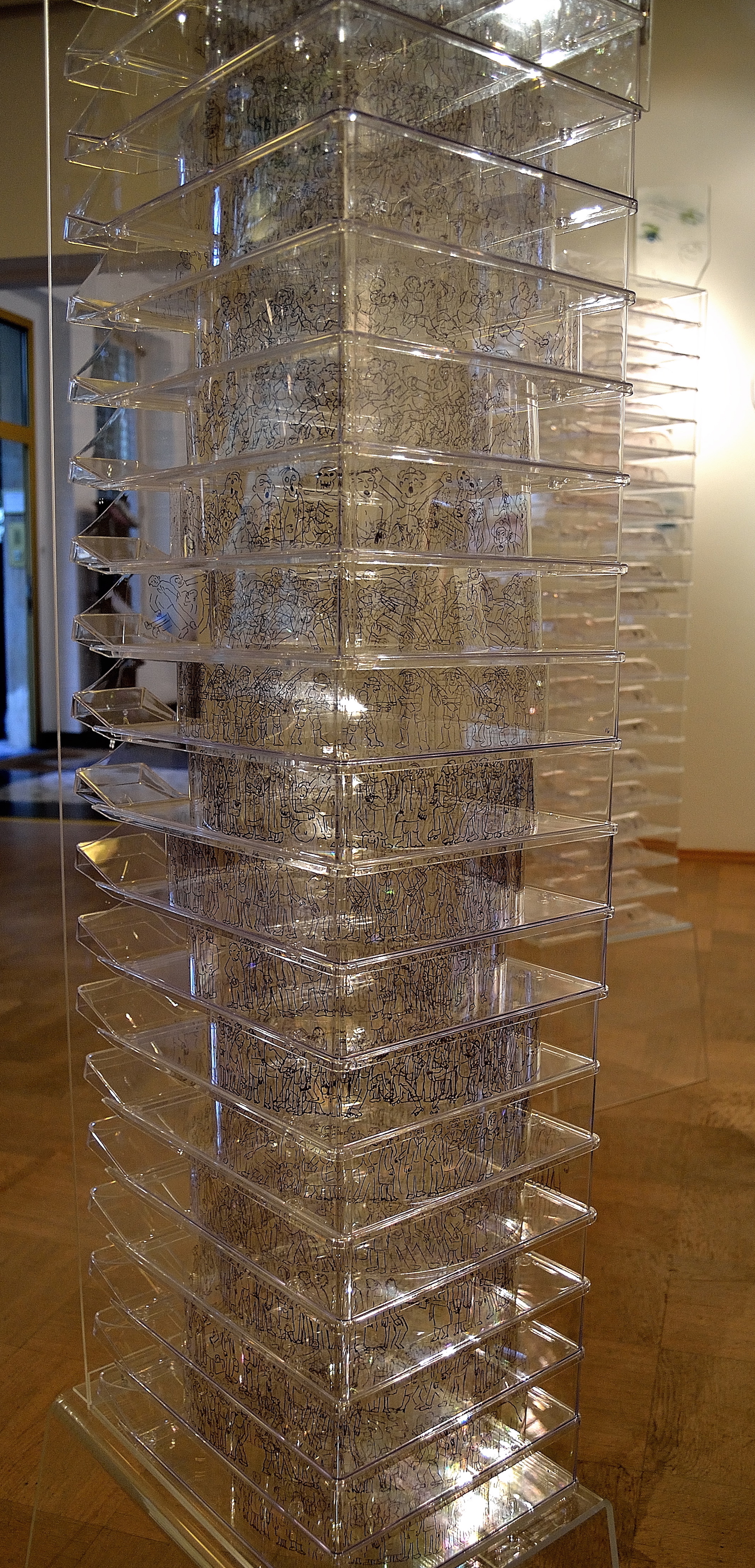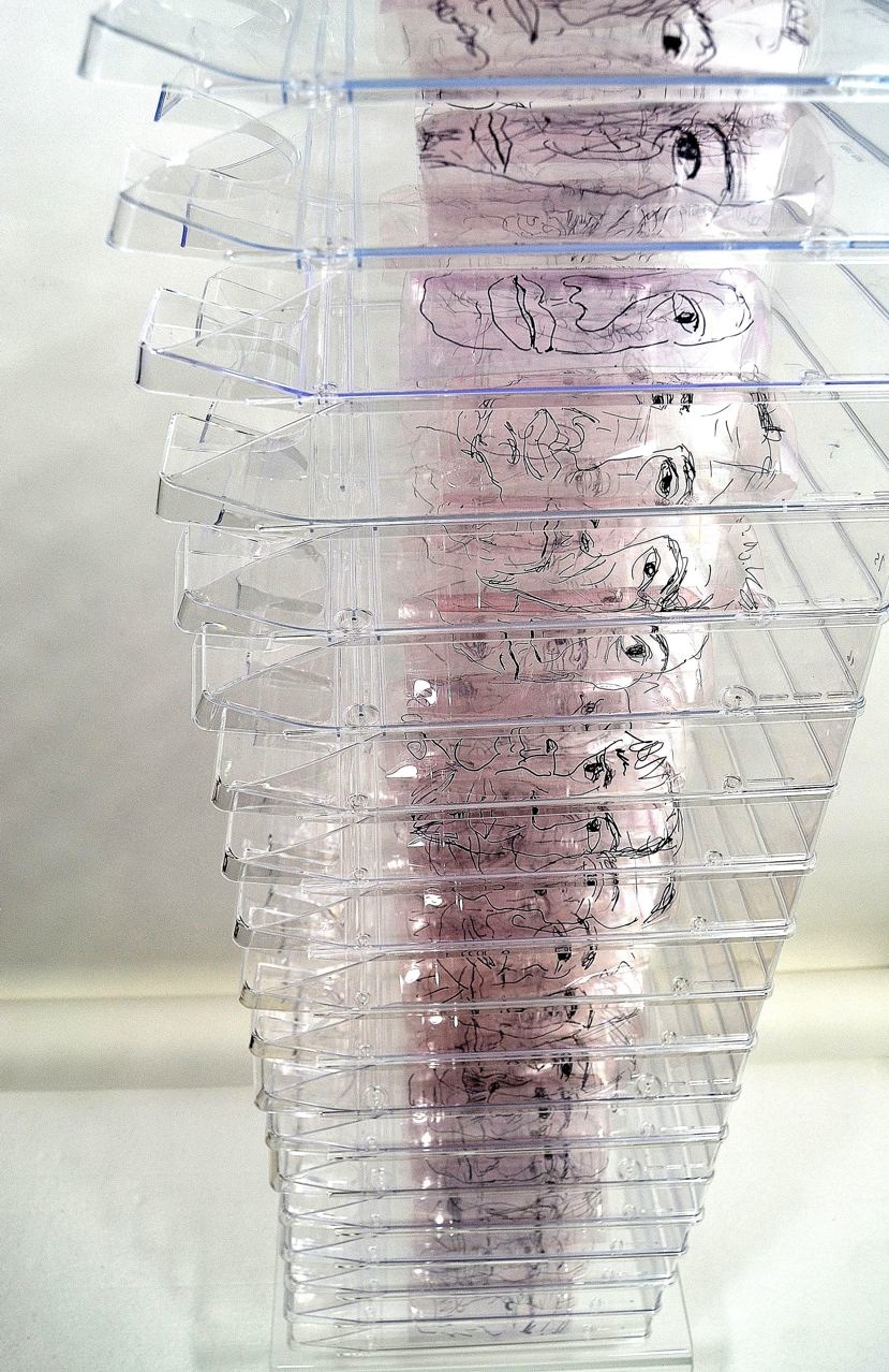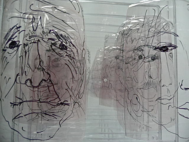 drawings on polyethylene, collage under Plexi glass,